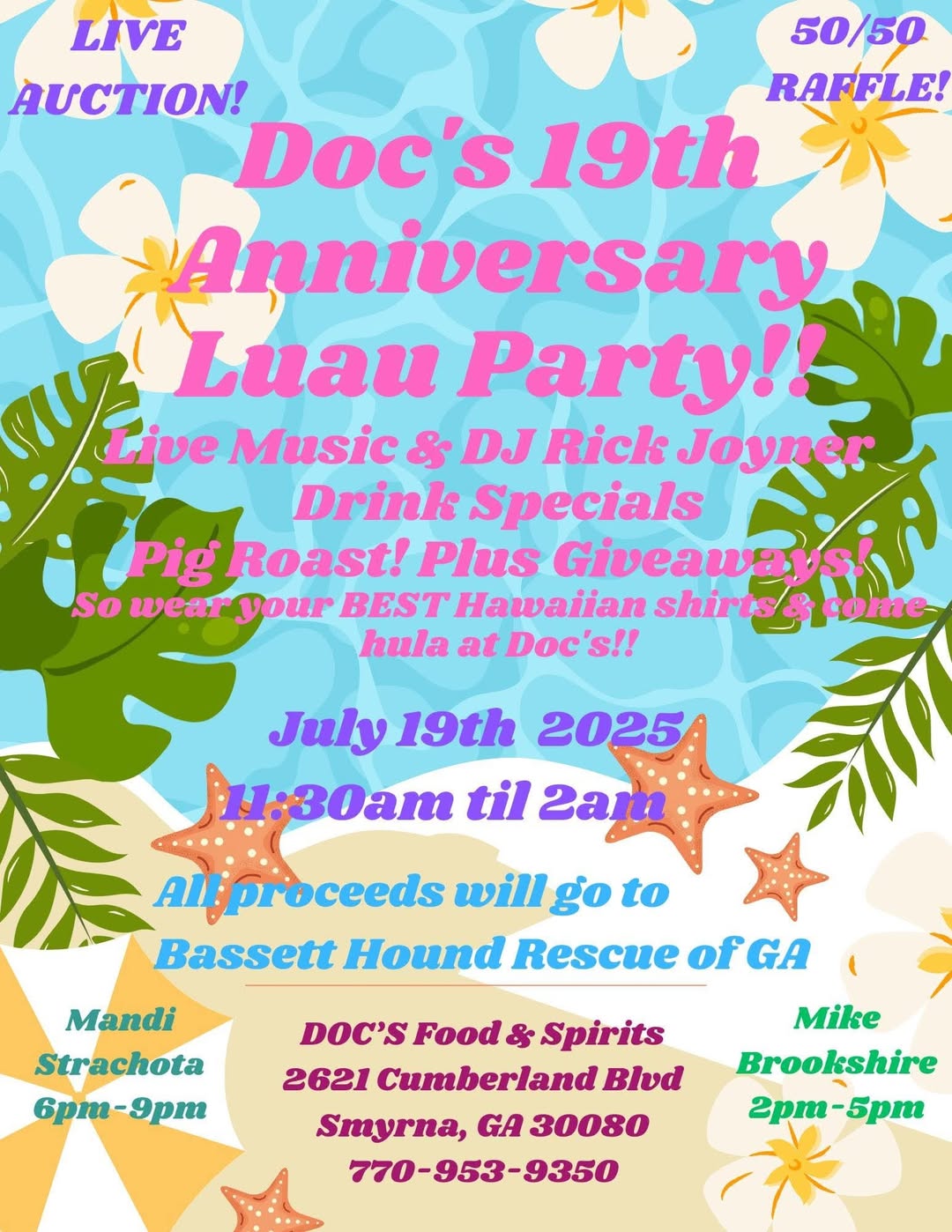 Yes!! Doc’s Annual Luau is happening again! There will as always be a pig roast, live music, DJ Rick Joyner, a raffle and giveaways! Let’s get lei’d!!!!!! I’ll be playing r&b and blues from 6 – 9. This place also has yummy late night food (check the specials, order a level down on the buffalo tenders – they are HOT!, and don’t sleep on the brownie bites… yeah, I might eat here a lot…) and a loyal crowd. My other family in GA…. I’m honored to still play here after all these years. I think I started playing here in 2006. And I may never stop. Good tunes, good food, mean drinks, and never a dull moment. Plus we’re making money for the Bassett Hound Rescue of GA. So…. YEAH.
